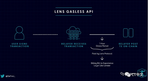 該API允許用戶簡單地簽署一條消息(例如,作為一條評論),然后中繼者接收這條消息與相關的信息,將數據上鏈,完成交易。對于中繼者來說,這種方法稍微有點耗gas費,因為他們必須驗證簽名,然后在鏈上發布數據。然而,它讓用戶體驗更有趣和滿意。應用層平臺需要支付gas費,這意味著Lenster或LensFrens有義務支付這些費用。雖然使用無gas費API的缺點是,用戶依賴中繼者在鏈上發布交易,而不是自己完成交易,但考慮到社交媒體發布不需要與金融交易相同的安全級別,這種權衡是值得的。此外,中繼器也增加了靈活性,有一個小時的寬限期,可以在鏈上正式發布交易,他們可以避免高gas費用的時期。