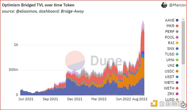 Dune 數據顯示,截止 8 月 17 日,Optimism Bridged TVL(跨鏈橋上停留的資產總額)達到近 14.27 億美元,而歷史最高值發生在 7 月 13 日的 14.95 億美元,也即目前跨鏈橋的 TVL 數據仍屬于歷史高位。