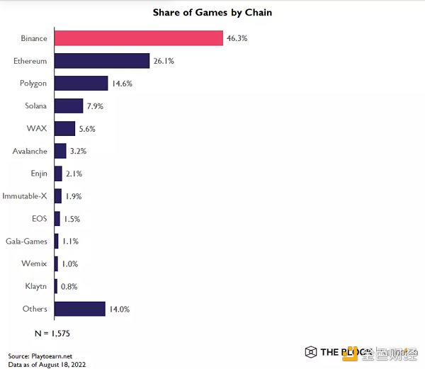 整個游戲市場大約有 1575 個項目,有 40% 左右集中在 BSC 上,26% 在以太坊,15% 在 Polygon。而像 ImmutableX、Gala Games、WAX、Enjin 和 WemixNetwork 等游戲專用鏈僅 1% 到 6% 的市場份額。
