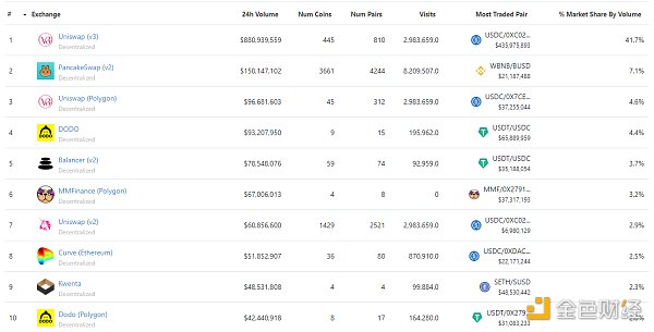 過去24小時去中心化交易所的交易量 數據來源:coingecko