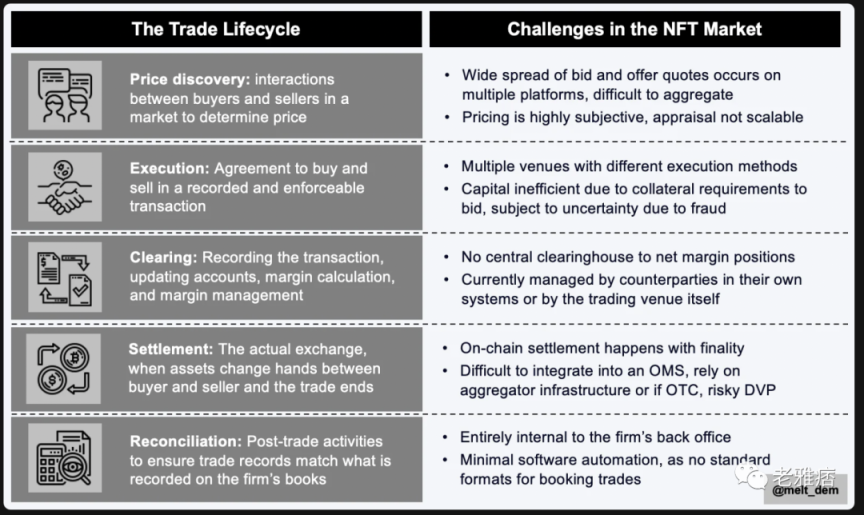 為了分解市場微觀結構,從高層次上理解交易的生命周期很有幫助。以下是對交易生命周期和當前 NFT 市場的一些挑戰的簡單介紹: