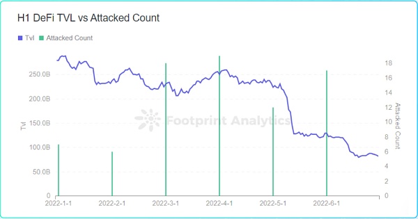 從整個加密貨幣市場上半年行情走勢來看,DeFi、NFT、GameFi等各大賽道發展總趨勢都是持續走低。整個DeFi總鎖倉量從1月初的2798億美元跌到了6月末的824億美元,半年下跌70.5%。分析發現,黑客攻擊事件頻率與市場行情走勢呈現出一定的關聯性。五六月份在TVL大幅縮水的情況下,黑客攻擊事件相對于前幾個月有所減少,更多的鏈上資金會吸引更多黑客的目光。
