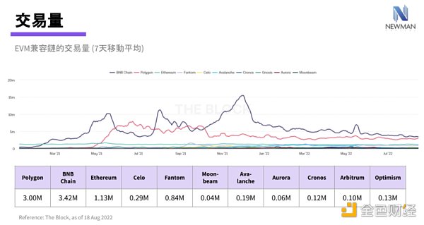 每日新獨特用戶地址: Polygon 一直是市場上最活躍的 EVM 兼容鏈之一。根據 The Block 的數據,在 2022 年 8 月上半月的大部分天數,Polygon 在 7 天的平均基礎上保持了大約 40 萬個新增獨特用戶地址,是相比主要競爭對手中最高的,如 BNB Chain。在同一時期,Polygon 在這個角標準上的表現也超過了其他主要的 L2;它的每天新增獨特用戶地址分別是 Arbitrum 和 Optimism 的 168 倍和 167 倍。