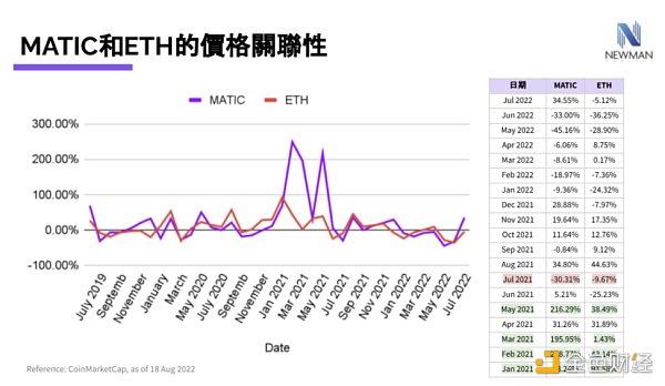 定價分析:我們的研究表明,自 2019 年 7 月以來,MATIC 和 ETH 之間的價格關聯性一直很高。唯一的例外是 2022 年第一季度,由于 MATIC 的推出,其價格躍升了 200%。 Polygon 生態系統主要催化劑包括產品發布、更新、收購和合作,而負面催化劑包括整體市場低迷和技術問題。 ( 注:2022 年 3 月,Polygon 遭遇技術問題,在 11 個小時內沒有生產新的區塊)。