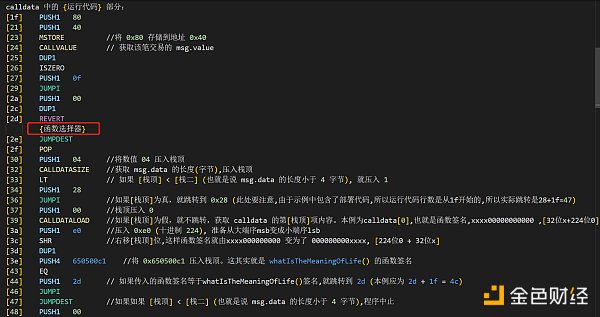 慢著,題目后面還有個小小的附加要求:“所部署的合約大小不超過10個操作碼”。好吧,這個要求的確夠“小”,要知道連合約頭部的 “函數選擇器” 都不止 10 個操作碼好吧?可是“函數選擇器” 是什么,為什么會出現在合約里面呢?帶著你的疑問,繼續向下看。