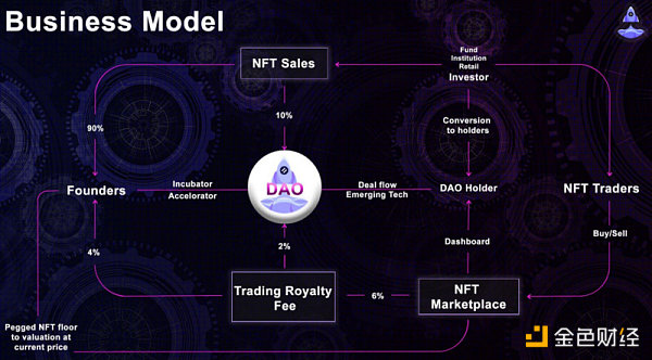 每個項目的創建都將創建一個系列的NFT來進行該籌款活動。該類行為我們統稱為INO(Initial NFT Offering) ,NFT公募將為提議的項目提供資金。NFT將為意向投資者提供早期投資該產品的機會。其中NFT銷售所得資金的百分之九十將由募資項目獲得,而其余的百分之十則回到The Science DAO作為資金儲備。而NFT交易中設置有百分之六的版稅,其中百分之四歸項目方所有,百分之二歸社區。