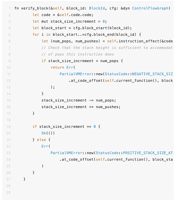 前面已經介紹過,由于movevm是棧虛擬機,在驗證指令合法性的時候,很顯然,第一需要確保指令字節碼是否正確,第二需要確保棧空間經過一個block代碼塊調用之后,棧內存合法,即棧操作之后,棧保持平衡。verify_block函數正是用來完成第二個目的的。