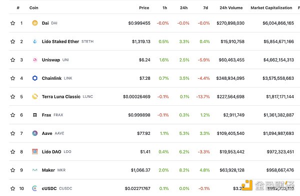 DeFi項目鎖定資產前十排名及鎖倉量 數據來源:defillama