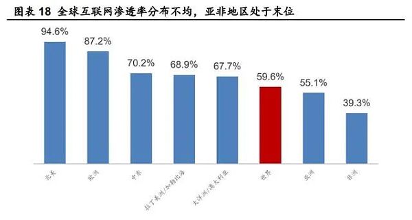 第一,全球各地區互聯網滲透率分布不均,亞非拉數字鴻溝仍存。根據 IWS 數 據,2020 年 5 月北美、歐洲地區互聯網滲透率分別高達 94.6%和 87.2%,而亞非地 區的互聯網滲透率排名末位,低于世界平均水平。這一現狀不利于元宇宙在全球范圍 內實現互聯互通、全面覆蓋每一個體的終極目標。
