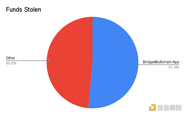 涉及跨鏈橋或多鏈應用程序(例如多鏈交易或多鏈借貸)對數據集產生了巨大的影響。盡管這些黑客事件只占總數的 10%,但卻竊取了 25.2 億美元的資金。