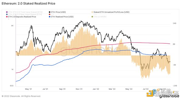 紅色曲線顯示的是質押存款的平均價格,目前為2326美元,比今天每個ETH的平均交易價格1300美元要低得多,這意味著驗證者產生了大量未實現的損失。這可以進一步從黃色圖表中看到,它顯示未實現損失的數額,目前為139億美元。