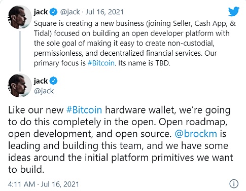 2021年7月16日,Square首席執行官 Jack Dorsey在推特上表示Square 將開設一項新業務,開發比特幣硬件錢包,能夠讓客戶更好的儲存比特幣。此推特發布后,Square股價上漲2.7%,當天收盤時漲幅1%。