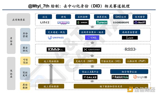 DID相關的賽道主要分應用場景、身份、憑證三層。憑證層是DID的構成組件,身份層是DID的具體形態,應用場景層是DID的價值體現。
