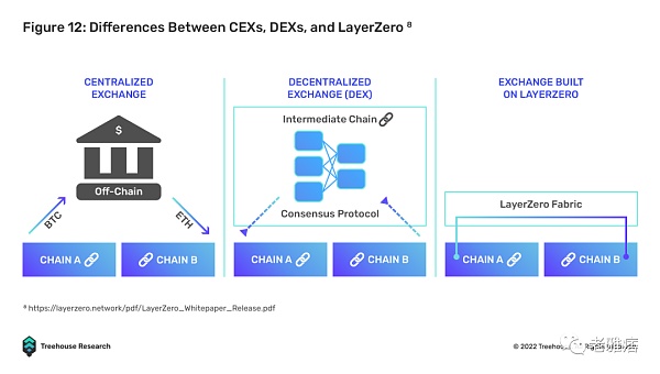 Relayer-Oracle 協議旨在解決 Relayer-Light Client 協議的新興問題,即成本效益低。LayerZero 是該領域最杰出的競爭者之一,它利用鏈上輕節點來促進跨鏈信息交換。發送者鏈的端點與指定的 Oracle 和 Relayer 以及接收者鏈進行通信。Oracle 消息將有問題的標頭阻止到接收者鏈的端點,而中繼器驗證交易。相比 Polkadot XCMP 依賴單條中繼鏈作為中介并引入瓶頸風險(如果中繼鏈發生故障,互操作性失敗),LayerZero 的 Relayer-Oracle 解決方案利用現有的端點輕節點進行安全性,相比于中繼鏈模型。