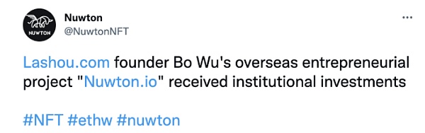 XRP/HKD-0.37%近日,ETHW鏈上NFT交易平臺Nuwton.io官方推特披露完成550萬美元融資,本輪融資由惟一資本、Wagmi33 Foundation等機構和若干天使投資人投資。Nuwton.io創始人為原拉手網創始人吳波。