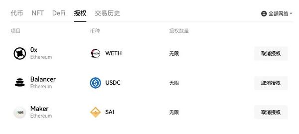 除此之外,用戶也可以點擊「資產看板」功能,追蹤自己在多條不同公鏈上不同協議的所有資產組合,包括代幣、DeFi 挖礦收益、NFT 收藏品、授權、交易歷史。一目了然,再也不需要在多個應用間不停切換。特別是「授權」查看,可以有效幫助用戶降低賬戶風險,如下所示: