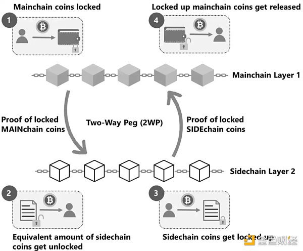 側鏈主要是通過雙向錨定的跨鏈橋(two way pegged cross chain bridge)來實現與主網的鏈接、以及互相操作(這個概念我們很快就會細說)。而這里所謂的雙向錨定式主要是指支持資產的雙向錨定,即資產在主鏈與側鏈之間的互轉。不過這里需要注意一下,實際上資產并非實現真正意義上的轉移,只是通過「一條鏈鎖定,另一條鏈鑄造相同面額資產」的方式來進行「跨鏈」。但凡是架設雙向錨定跨鏈橋的項目都可以被視為側鏈。
