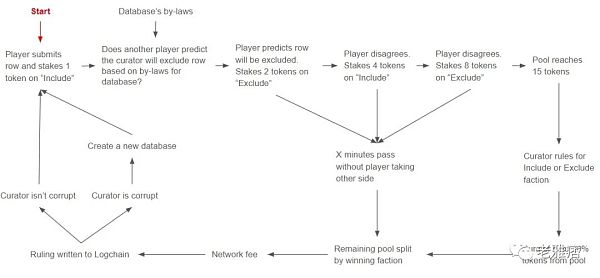 整體來說,任何人都可以提議向數據庫添加row。當第一個玩家添加他們的元素時,他們用1個代幣驗證該元素是集合的一部分,所以它將被默認為包括在內。隨后的玩家可以通過加倍驗證元素的代幣數量,將該元素從包含在集合中“翻轉”為不包含在集合中。如果該元素之前是用1個代幣驗證的,那么它可以用2個代幣排除。一個元素在被包含和被排除之間繼續轉變,變化的方式是將之前的押注值翻倍。翻倍一直持續到贊成派或反對派在人群超時時間內沒有進行下一次投注而輸掉。失敗派系的代幣由獲勝派系分割。