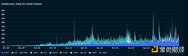 直到 2020 年 1 月,我們在一天之內看到大約 10 億美元通過穩定幣在鏈上流動。這個數字現在在隨機的一天上升了約 25 倍。在 2022 年 5 月的混亂中——價值約 870 億美元的穩定幣在錢包之間移動。