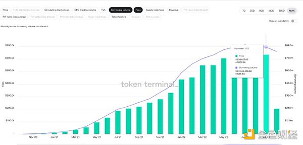 事實上,抵押貸款不足可能是這個市場周期中最健康的部門之一。下圖適用于 Centrifuge - 他們的費用和借入量均為 ATH。