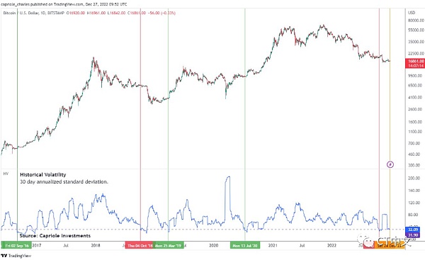 附帶的一張圖表顯示了比特幣波動率的30天年化標準差,目前處于過去五年里只出現過幾次的低點。