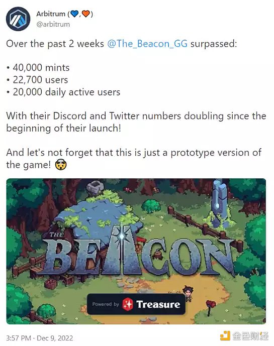 此外,像 Treasure DAO 這樣的項目已經為 Arbitrum 帶來了大量 NFT 場景的基礎,所以好戲可能才剛剛開始。對于像 The Beacon 這樣的項目來說也是如此,這是一款免費的 RPG 游戲,剛剛獲得了爆炸性的發布,并將為 Arbitrrum 帶來巨大的活躍度。我認為,這些都只是 L2 游戲的開始。