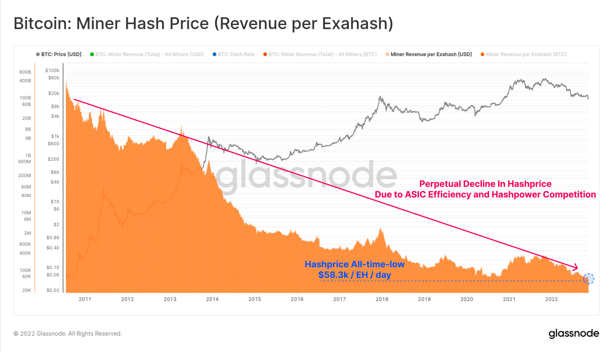比特幣礦工哈希價格已跌至每天 5.83 萬美元 / EH 的歷史新低,接近許多礦機的關機價格。