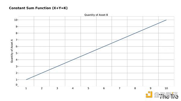 CFMM(恒定函數做市商)這一迭代可以用來解決滑點問題,它是被描述為常數和函數(x+y=k)的線性不變模型,可以可視化為一條直線。恒定和做市強制池中兩種資產的數量一致,從而顯著降低了發生滑點的機會。
