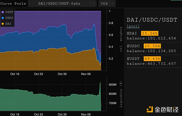 這表明,流動性提供者害怕USDT風險敞口,通過從池中撤出USDC和DAI“逃離”。