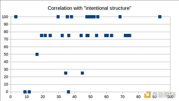 “大眾認可精英”和“精英監督專家”相關性高。第二個比第一個高,盡管Hanson和我可能對“recognize”有不同的理解。“意向結構”圖表的右下角是空的,但左上角是完整的,這表明意向結構是必要的,但不足以使某物成為制度。