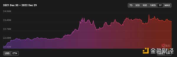 橋接到 L2 的資產的美元價值從 57 億美元下降到了 41 億美元,下降了 28.6%。然而,這可能是由于加密貨幣價格的下跌,而不是用戶資金的撤出,因為以 ETH 計價的 TVL 從 160 萬上升到了 340 萬,上升了 120.6%。這表明,扣除價格,L2 在 2022 年有著大量的流動性流入。