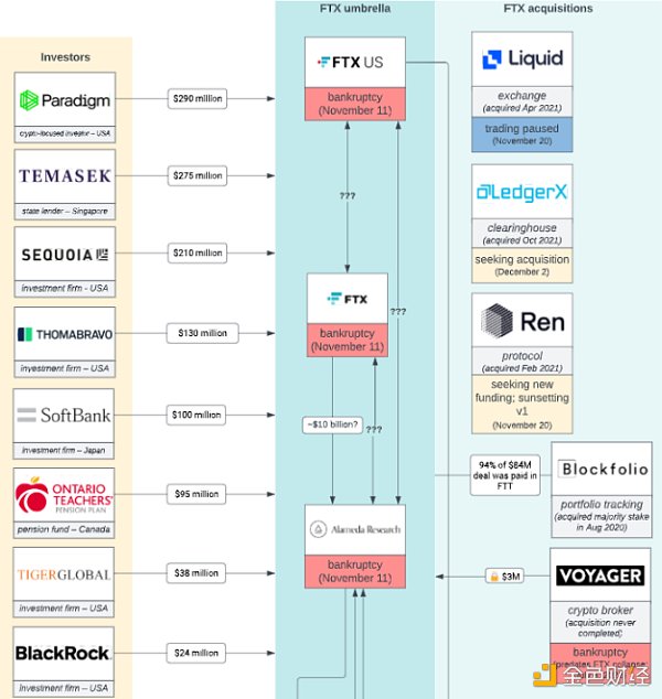 在這里只是敘述了 FTX 事件本身,而這起黑天鵝事件引發的多米諾骨牌效應,更是慘不忍睹或仍有許多未被揭露。加密研究員 Molly White 制作了 FTX 的擴散關系圖,呈現 FTX 與不同機構間的資金關系。