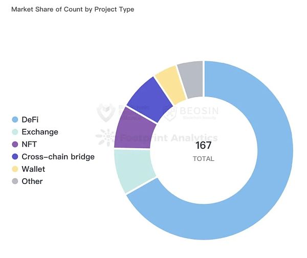 從項目類型來看,12次跨鏈橋安全事件共造成了約18.9億美元損失,居所有項目類型損失的第一位。DeFi類型項目被攻擊了113次,約為67.6%,是被攻擊頻次最高的項目類型。