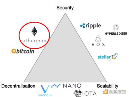 區塊鏈的三個理想屬性是去中心化、安全和可擴展,但一個基本的區塊鏈架構只能實現其中的兩個(不可能三角)。以太坊選擇了去中心化和安全,導致以太鏈本身的可擴展性較低,原因在于: