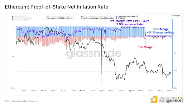 隨著向權益證明(PoS)的過渡,以太坊貨幣政策被調整為顯著降低的排放計劃。 名義發行率(藍色)約為 +0.5%,但考慮到 EIP1559 燃燒機制(紅色)后,這幾乎完全抵消了發行。 相比之下,合并前的凈通貨膨脹率為 +3.9%,這表明發行量的變化有多么巨大。