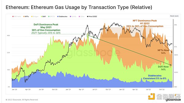 在類似的繁榮-蕭條周期中,到 2022 年上半年,與 NFT 相關的交易占 gas 使用量的 20% 至 38%,但現在也已降至 14% 的主導地位。 穩定幣在今年全年保持穩定的 5% - 6% 的主導地位。
