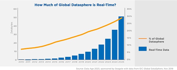 IDC預測,到2025年,全球將有超過1500億臺的聯網設備,其中大多數將實時創建數據。例如,生產車間的自動化機器依靠實時數據進行工藝控制和改進。實時數據在2017年占數據圈的15%,到2025年將近30%(圖8)。