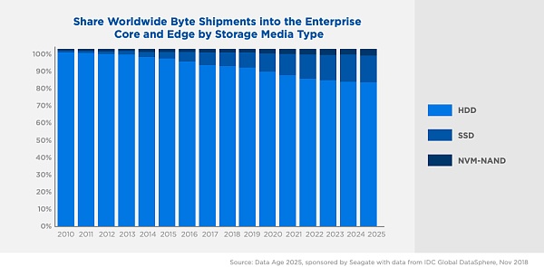 端點和邊緣存儲的增長將有利于固態存儲,而核心對HDD和磁帶提供的經濟型存儲容量仍然有極大的需求。企業將組合使用磁盤驅動器、SSD、閃存和磁帶,以滿足對性能、管理和歸檔的需求。到2025年底,與SSD和其他NVM技術相比,邊緣數據將仍以HDD為主,超過80%的企業數據將轉移到核心(圖11)。