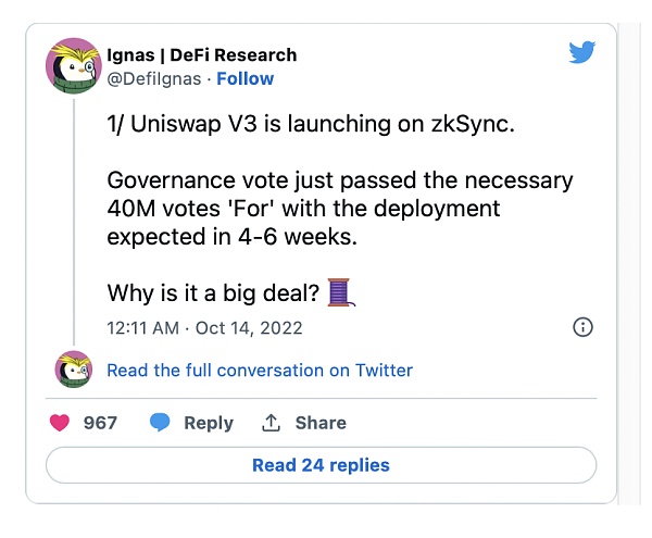 影響其他協議的治理。Uniswap DAO投票決定在zkSync上啟動,這可能會讓zkSync在zk-Rollup競賽中占據領導地位。