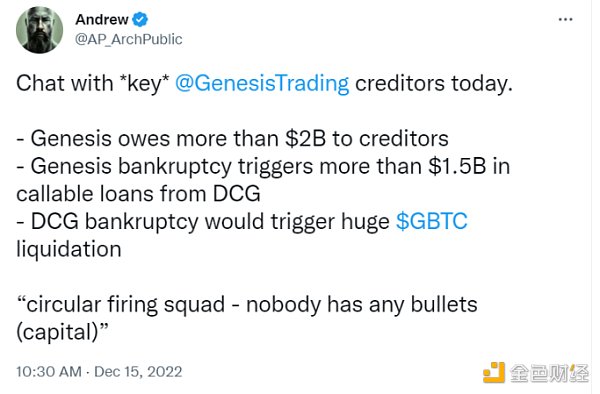 關于 DCG 的危機最早是由一名推特用戶爆料出來,但是當時市場的焦點還在考慮美聯儲加息對于市場的影響。12 月 15 日,推特用戶 Andrew 發推表示,已與 Genesis 債權人溝通,其中 Genesis 欠債權人超過 20 億美元,Genesis 破產將觸發來自 DCG 的超 15 億美元的可贖回貸款,而 DCG 破產將引發巨額 GBTC 清算。