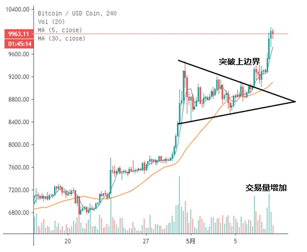 “在5月6日我曾說過,從技術分析的角度看,5月6日左右比特幣市場已經進入了三角旗形的持續形態中。4月末比特幣價格突然由7,500美元上漲至9,400美元,這種幾乎直線式的價格運動形成了三角旗形的旗桿,隨后市場交易量下滑,進入持續整理階段,一般而言,三角旗形形態會持續2-3周,預計短期內比特幣的價格會突破該形態:如果比特幣價格擊穿下邊界,那么比特幣很有可能進入下跌通道,如果比特幣價格擊穿上邊界,那么比特幣將繼續上漲。目前比特幣已經突破了上邊界,所以從短期看,比特幣仍然會處于上升趨勢。”