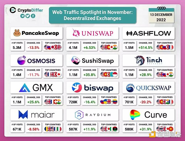 依據網絡流量數據來評判,排名再次發生變化——PancakeSwap 獨占鰲頭,因此,相比于純粹的指標排名,我更關注 DEX 的創新性、獨特性以及它們給加密領域做出了什么樣的貢獻。