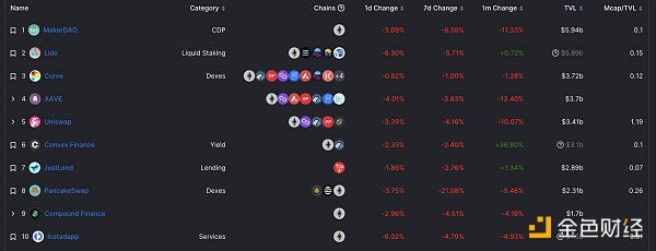 DeFi項目鎖定資產前十排名及鎖倉量 數據來源:defillama
