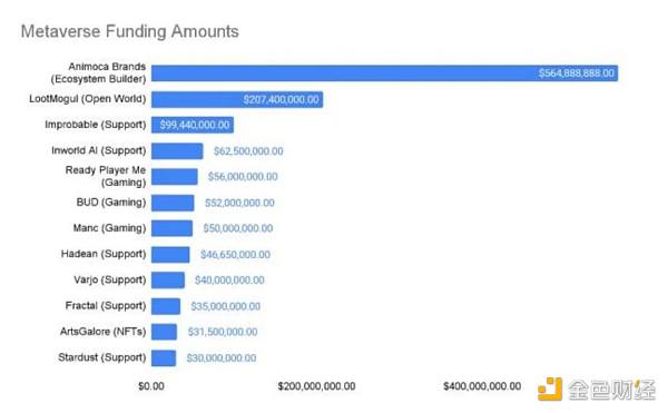 風險投資者迅速捕捉到了這些趨勢。支持元宇宙的創業公司是主要受益者。游戲初創公司也不甘落后,特別是那些擴展現實(XR)領域的初創公司。但獲得最多資金的是Web3巨頭Animoca Brands。這遵循了近年來的一個模式,即投資者為處于后期的生態系統提供資金,然后讓這些生態系統為處于早期階段的初創公司提供資金。我們已經在所有主要的區塊鏈生態系統中看到了這一趨勢,現在我們在生態系統不可知的 Animoca Brands 身上也看到了它。