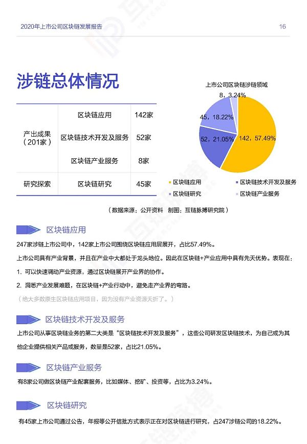 247家涉鏈上市公司中,142家上市公司圍繞區塊鏈應用層展開,占比57.49%。其他有從事“區塊鏈技術開發及服務”、“產業配套服務”以及“研究”等;