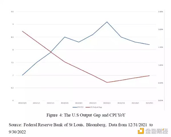 根據美林時鐘的理論,我們可以依據最近的產出缺口數據和 CPI 數據分析當前所處的周期區間。由于美國國會預算辦公室(CBO: Congressional Budget Office)公布的年度名義產出缺口數據目前只更新到 2022 年一季度數據,因此這里我們將使用圣路易斯聯儲 (Federal Reserve Bank of St Louis) 公布的美國產出缺口數據和美國勞工統計局(Bureau of Labor Statistics)公布的 CPI 同比數據進行分析,如下圖: