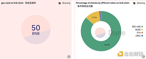 此外,我們對攻擊者的攻擊成本進行了分析,目前總成本接近2.9W USD(50 BNB + 11 ETH),攻擊者對BSC-USD和USDT非常偏愛,與穩定幣的幣種流通量和用戶持有量有關