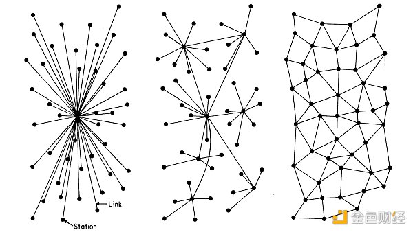 中心化是一個范圍,從具有單個 Hub 的網絡(左)到每個節點權力相等的完全扁平網絡。Brander 所指的中心化類型是中間類型,無標度網絡:長尾分布的冪律。