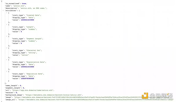 4、tokenURI 問題:ENS 的基礎注冊器合約并沒有即成 ERC721 標準的 tokenURI,可能是設計之初沒有考慮好,所以目前我們在交易市場比如 opensea 上的 ENS 的 NFT 的 metadata,是交易市場特殊對 ENS 即成了 ENS 中心化的 metaservice 的 API(比如:https://metadata.ens.domains/mainnet/0x57f1887a8bf19b14fc0df6fd9b2acc9af147ea85/92165218023603606815515740961699344403389102980529428548045197994533319339809)。