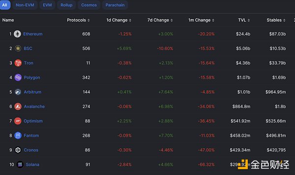 Arbitrum 和 Optimism 的 TVL 排名從十名以外逐步進入前十。